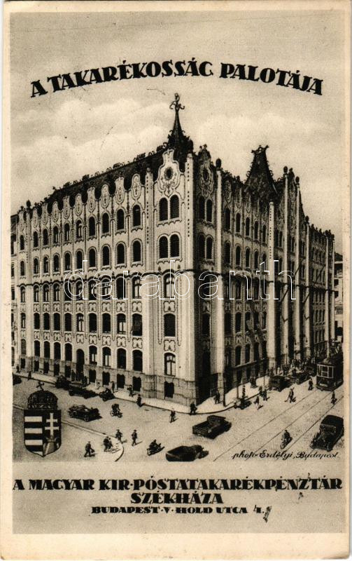 Budapest V. A Takarékosság palotája, Magyar királyi Posta Takarékpénztár székháza, villamos, automobil, magyar címer. Photo Erdélyi. Hold utca 4. + "1938 Rimaszombat visszatért" So. Stpl. (EK)