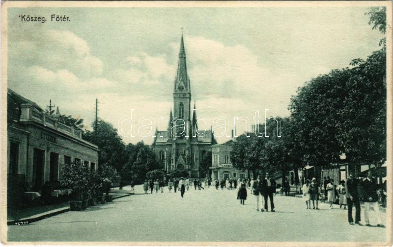 Beschreibung: Kőszeg, Fő tér, templom, étterem. Róth Jenő kiadása
