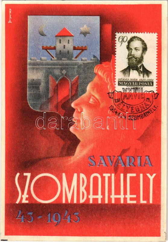 Szombathely, Emlék Szombathely 1900 éves városi múltjából. Tiberius Claudius római császár 1900 évvel ezelőtt Kr. u. 43-ban Savaria névvel városi rangra emelte Szombathely + "XXVII. Bélyegnap 1954. X. 24. Szombathely" So. Stpl.