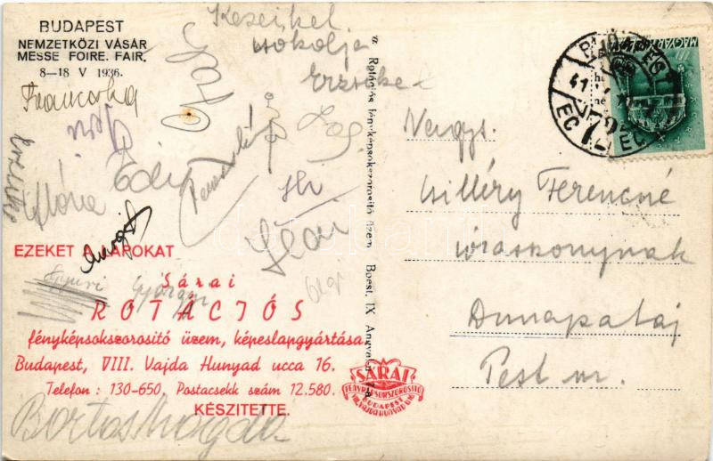 Beschreibung: 1936 Jenai Durax Üveg tűzálló a BNV Budapesti Nemzetközi Vásáron. Hátoldalon Sárai Rotációs fényképsokszorosító üzem és képeslapgyártó reklámja