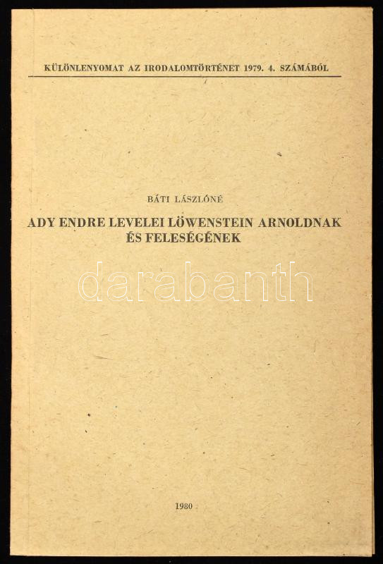 Báti Lászlóné: Ady Endre levelei Löwenstein Arnoldnak és feleségének. Különlenyomat az Irodalomtörténet 1979. 4. számából. Bp., 1980, Akadémiai Nyomda. Kiadói papírkötés, jó állapotban.