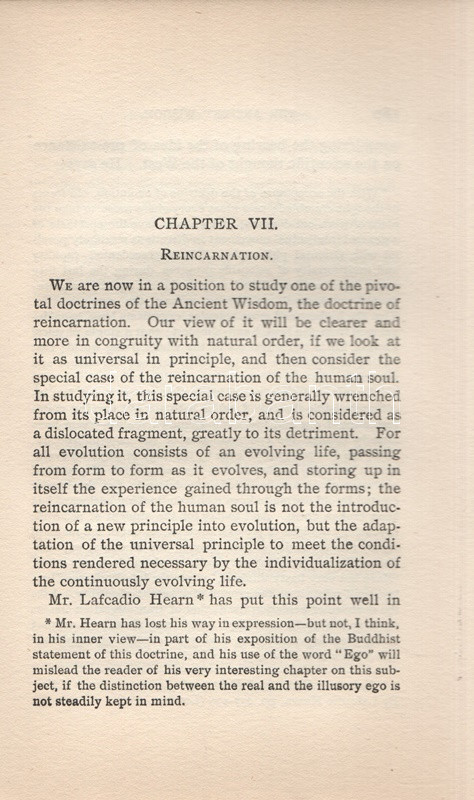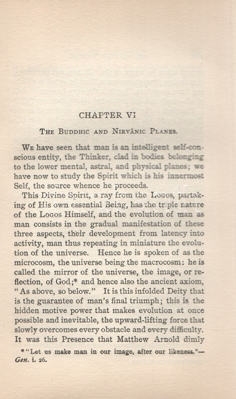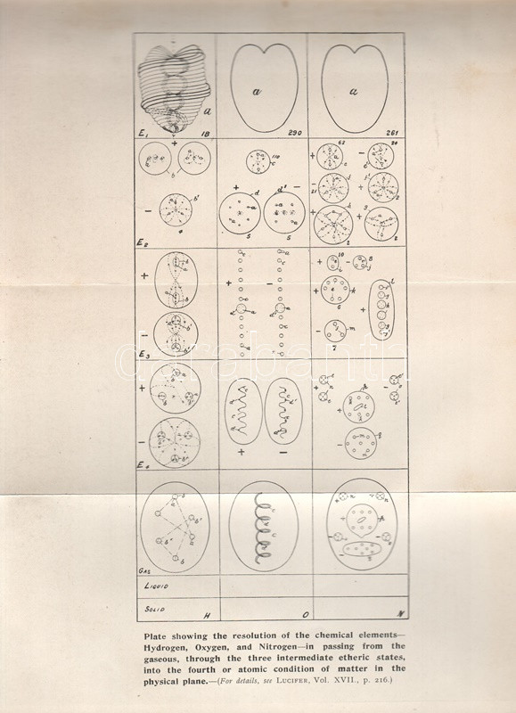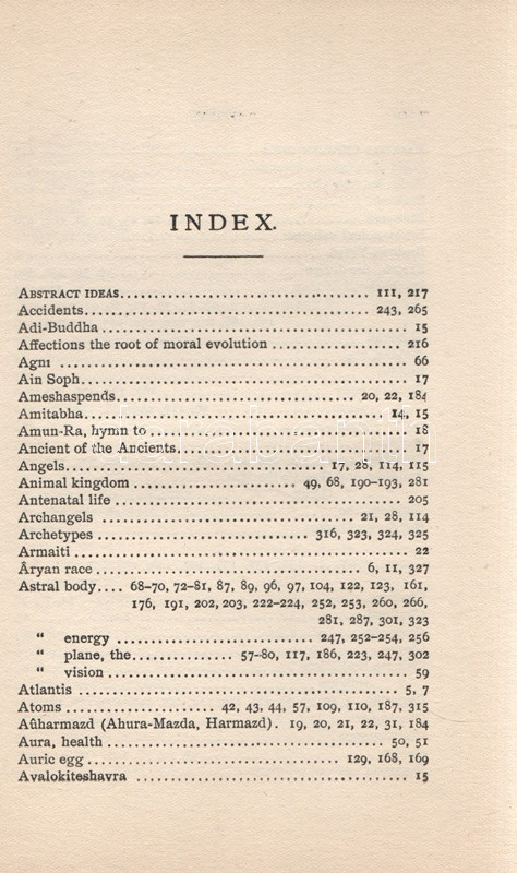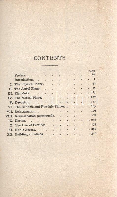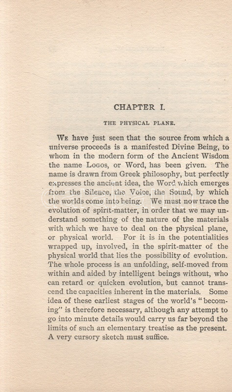 Besant, Annie: The Ancient Wisdom. An Outline of Theosophical Teachings. London, 1910. Theosophical Publishing Society. [8] + 338 + [4] p. + 1 t. (kihajtható). Annie Besant (1847-1933) teozófus kötete a földi, materiális világgal párhuzamosan létező asztrális, buddhikus és nirvánikus dimenziók elméletét fejti ki, valamint hosszan értekezik a reinkarnáció és a karma koncepcióiról. A szabadkőműves, harcos ateista, nőjogi mozgalmár az 1880-as években fábiánus szocialista életét élte, majd 1890 táján újabb kurrens gondolatra lelt a teozófia területén, mélyen beépült az európai ezoterikus mozgalomba, elfoglalva később a Teozófiai Társaság elnöki pozícióját is, majd a brit uralom alatt élő Indiában további ezoterikus és politikai vezetőszerepet is vállalt. ,,The Ancient Wisdom" című munkája először 1897-ben jelent meg, példányunk az 1910. évi 10. utánnyomásból származik. A kötet végén részletes tárgymutató. Aranyozott, festett, szecessziós kiadói egészvászon kötésben. Részben felvágatlan, jó példány.