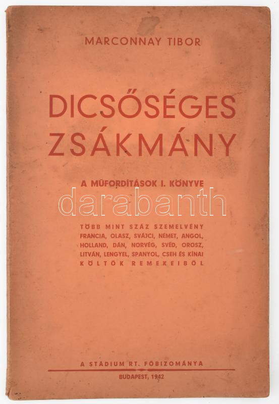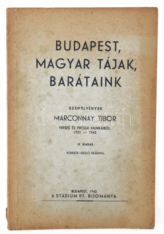 Budapest, magyar tájak, barátaink. Szemelvények Marconnay Tibor verses és prózai munkáiból 1921-1942. Kondor László rajzaival. Bp., 1942, Stádium. Kiadói papírkötés, gerinc kissé sérült, kopottas állapotban.