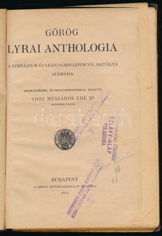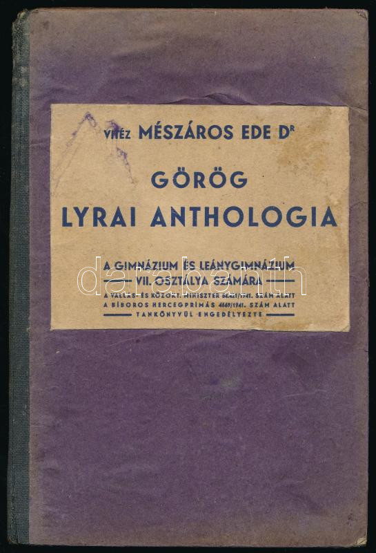 Görög lyrai anthologia. A gimnáziumi és leánygimnáziumi VII. osztálya számára. Bev. és magyarázatokkal ellátta: vitéz Mészáros Ede Dr. Bp., 1941, Szent István, 84 p. Félvászon-kötésben, kopott borítóval, a címlapon bélyegzésekkel, ceruzás bejelölésekkel.