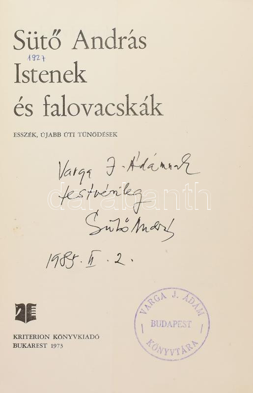 Sütő András: Istenek és falovacskák. Esszék, újabb úti tűnődések. A szerző, Sütő András (1927-2006) Herder- és Kossuth-díjas erdélyi magyar író által DEDIKÁLT példány! Bukarest, 1973, Kriterion. Kiadói papírkötés, kopott borítóval, a gerincen kis sérüléssel.