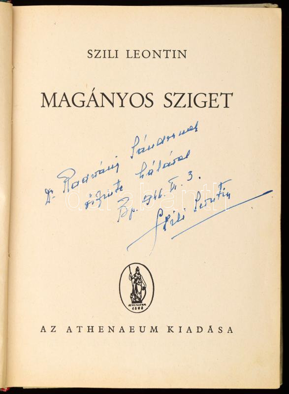 Szili Leontin: Magányos sziget. A szerző, Szili Leontin (1901-1987) író, dramaturg által DEDIKÁLT példány! Bp.,[1944.], Athenaeum, 322 p. Első magyar kiadás! Kiadói félvászon-kötés, kissé kopott borítóval.