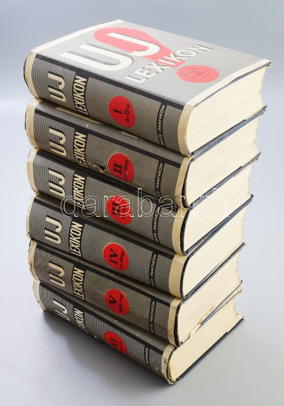 Uj Lexikon I-VI. Szerk.: Dormándi László és Juhász Vilmos. Bp., 1936., Dante - Panthon. Kiadói aranyozott egészvászon-kötés, kiadói papír védőborítóban, kissé kopott borítókkal, a papírborítókon egy-két kisebb sérüléssel, néhány kötet laza kötéssel. Papírborítóval együtt rendkívül ritka!
