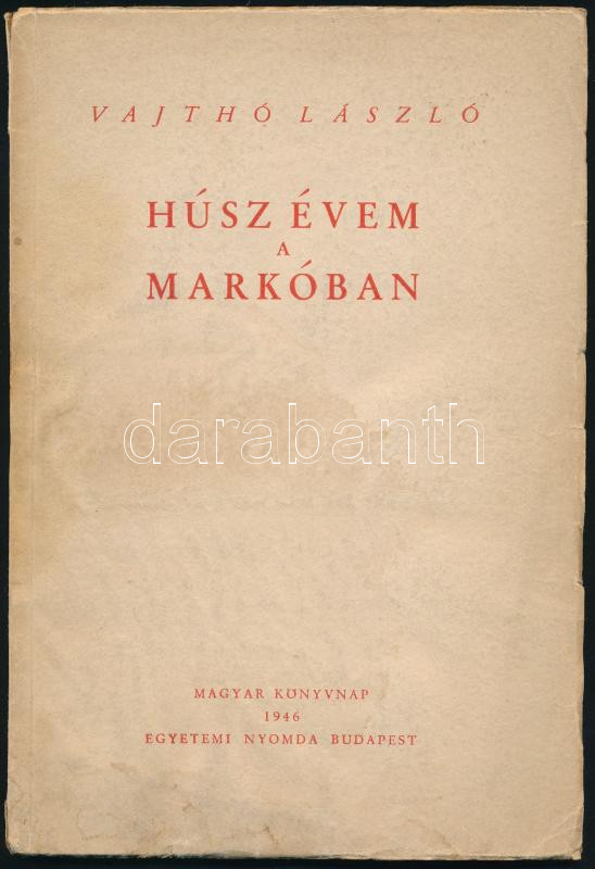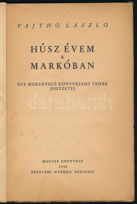 Vajthó László: Húsz évem a Markóban. Egy műkedvelő könyvkiadó tanár jegyzetei. Bp., 1946, Magyar Könyvnap - Egyetemi Nyomda. Kiadói papírkötés, szakadt borítóval, foltos.