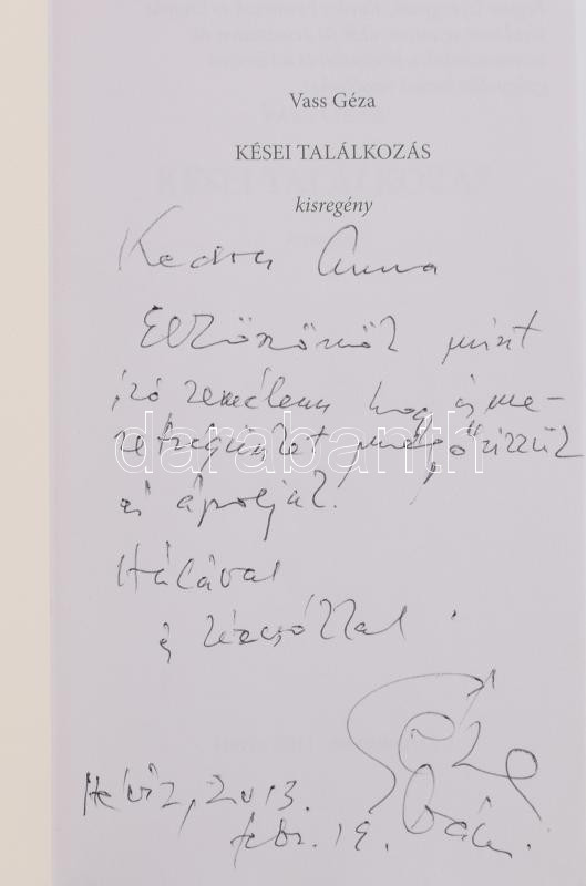 Vass Géza: Kései találkozás. A borítót rajzolta Budai Mihály. DEDIKÁLT Dr. Szigethy Anna (1948-2023) vezető főorvos, pszichiáter, addiktológus, neurológus, pszichoterapeuta, családterapeuta részére. Hévíz, 2011, Ziegler-nyomda. Kiadói papírkötés, kissé kopottas állapotban.