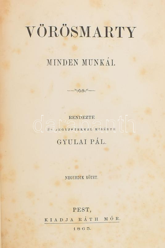 Vörösmarty minden munkái. IV. kötet. Rendezte és jegyzetekkel kísérte: Gyulai Pál. Pest, 1863., Ráth Mór, 4+ 299 + 2p. Kiadói aranyozott egészvászon kötésben, aranyozott lapélekkel