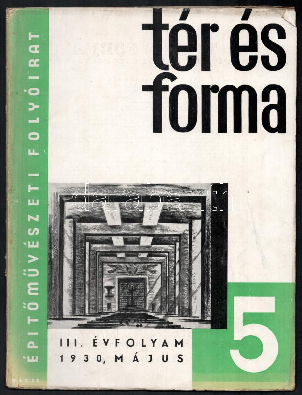 1930 Tér és Forma építőművészeti folyóirat III. évf. 5. száma, 1930. május. Bp., Biro Miklós-ny., X p.+ 215-256 p. Fekete-fehér képekkel, hirdetésekkel. A borító Kaesz Gyula munkája. Kiadói papírkötés, kissé viseltes borítóval.