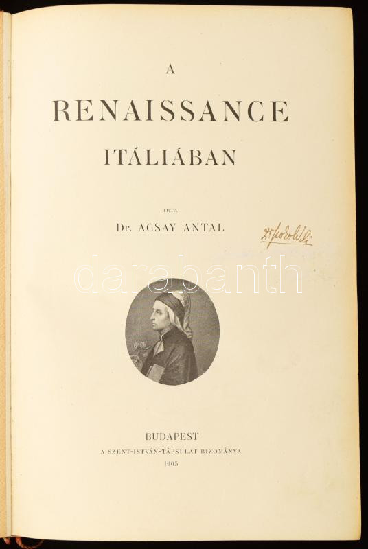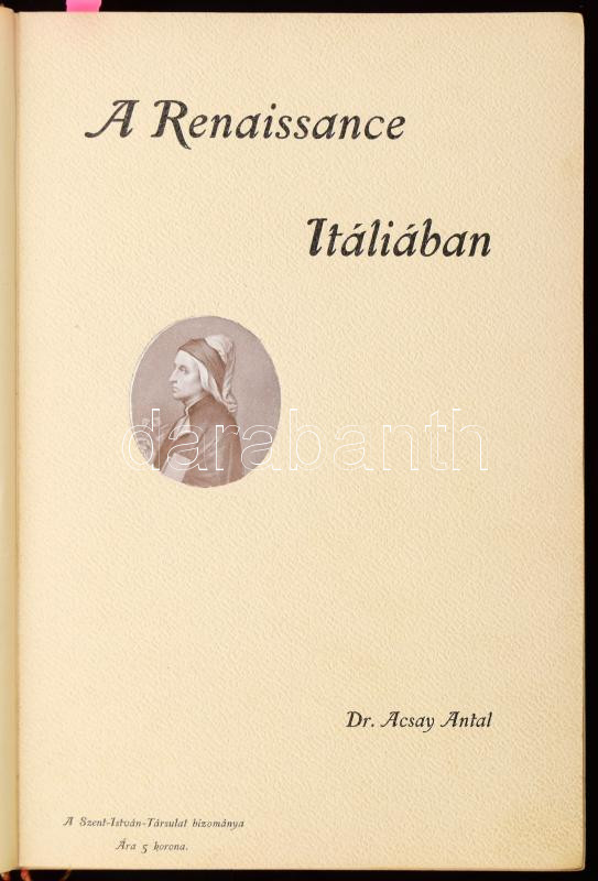 Acsay Antal: A Renaissance Itáliában. Bp., 1905, Szent István-Társulat, 274 p. Korabeli átkötött félbőr-kötésben, bekötött eredeti elülső papírborítóval, kopott borítóval, Szokol Vilibáld (1888-1963) festőművész könyvtárából és autográf névbejegyzésével, és a könyvben feltehetőleg saját bejegyzéseivel, aláhúzásaival, bejelöléseivel.