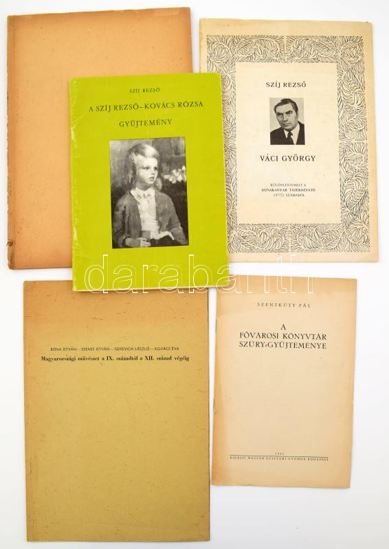 Vegyes művészeti témájú könyvtétel: Szíj Rezső: A Szíj Rezső- Kovács Rózsa gyűjtemény. (Mosonmagyaróvár.) Mosonmagyaróvár, 1988., (Győr,Széchenyi-ny.),49 p. Kiadói papírkötés.; Szentkúty Pál: A Fővárosi Könyvtár Szüry-Gyűjteménye. Bp., 1943, Kir. M. Egyetemi Nyomda, 8 p.; Szíj Rezső: Váci György. Különlenyomat. [Bp.], 1977, Kossuth, 11+1 p. Kiadói papírkötés.; Bóna István - Dienes István - Gerevich László - Kovács Éva: Magyarországi művészet a IX. századtól a XII. század végéig. Különlenyomat. Bp., 1976., Akadémiai-ny., 237-242 p. Kiadói papírkötés.; Ballenegger Zsuzsanna: Hormayr és a magyar romantika. hn., én., nyn., gépelt, 66 p. Papírkötés.