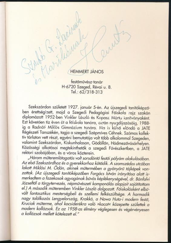 Beschreibung: cca 2000 Hemmert János (1927-2010) festőművész kiállítási prospektusa. A művész által DEDIKÁLT!