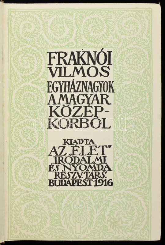 Fraknói Vilmos: Egyháznagyok a magyar középkorból. Bibliotheca Vitae - Az Élet Könyvei. Bp., 1916, ,,Élet" Irodalmi és Nyomda R.T., 2 sztl. lev.+ 336+(2) p. A kötésterv és a címlap Zádor István munkája. Kiadói egészvászon-kötés, nagyrészt jó állapotban.