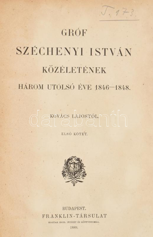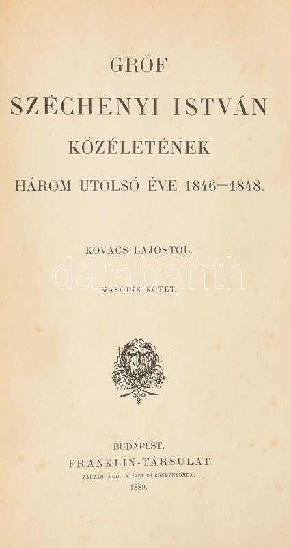 Kovács Lajos: Gróf Széchenyi István közéletének három utolsó éve 1846-1848. I-II. köt. [Egybekötve]. Bp., 1889, Franklin-Társulat, 271+(1) p.; 317+(3) p. Átkötött félvászon-kötésben, kissé viseltes borítóval, a hátsó kötéstábla deformált, belül nagyrészt jó állapotban, helyenként kissé foltos lapokkal, ceruzás bejegyzésekkel és aláhúzásokkal.