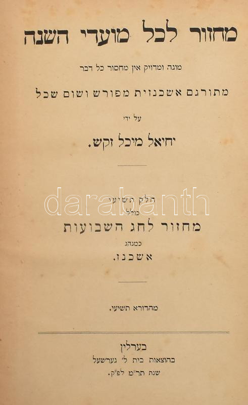 Sachs, Michael: Festgebete der Israeliten [...]. Berlin, 1880, Louis H... https://www.darabanth.com/de/477-Fernauktion/477.0/Bucher/Bucher-Judaica~2000031/Sachs-Michael-Festgebete-der-Israeliten-Berlin-1880-Louis-Herschel-Kiadoi-felvaszon-k~II3253171