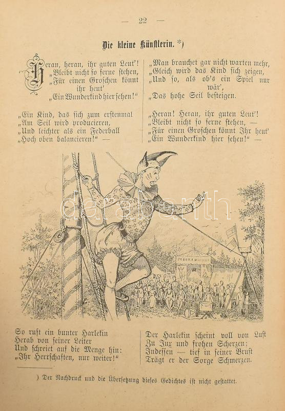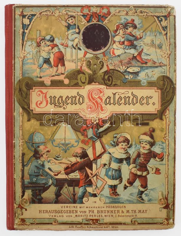 Illustrierter Jugendkalender für 1886. Album zur Erheiterung Belehrung. Hrsg. von Ph. Brunner und M. Th. May. Zeichnungen von Hugo Ströhl, Karl Geiger u. a. Zweiter Jahrgang. Wien, 1886, Moritz Perles, 16+153+1+6 p. Német nyelven. Szövegközti fekete-fehér illusztrációkkal. Kiadói illusztrált félvászon-kötés, színes litografált borítóval, kopott borítóval, a címlapon adóbélyeggel.