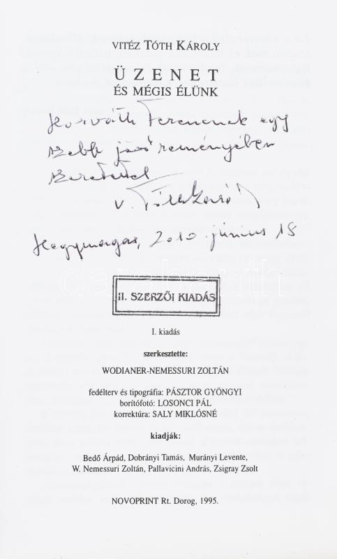 vitéz Tóth Károly: Üzenet - és mégis élünk. Emlékiratok. (Dedikált!) Dorog, 1995, Novoprint Rt. Második kiadás. Kiadói papírkötés, jó állapotban. A szerző, vitéz Tóth Károly (1929-2021), a Radetzky Hagyományőrző Huszár Egyesület kapitánya által dedikált példány.