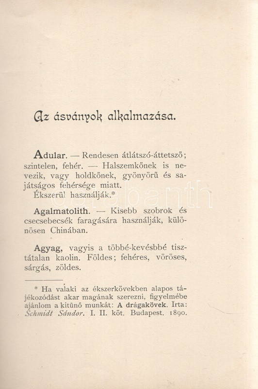 Tóth Mike: Az ásványok s az élet. Kalocsa, 1903. Jurcsó Antal könyvnyomdája. 92 p. Egyetlen kiadás. Tóth Mike (1838-1932) jezsuita áldozópap és kalocsai főgimnáziumi tanár. Kalocsán természettant és természetrajzot oktatott, ásványtani munkájában a természettudományok tanulmányozására hív föl. Stílusmutatvány: ,,Egy szójárást - az életnek tanulunk - sokan úgy szeretnék értelmezni, hogy csak azt kellene tanulnunk, mi közvetlenül a közönséges élet fönntartásához, a kenyérkeresethez tartozik. Ez a felfogás határozottan téves. Maga az igazság felismerése, a történelmi események okainak felkutatása, a természet törvényeinek belátása, és sok más hasonló az ember szellemének kenyere, és életének fűszere. Ha tőle ezt a táplálékot megvonjuk, csak ferde irányú embert nevelhetünk, kinek élete az igavonó állat életénél sivárabb". Példányunk fűzése meglazult. Fűzve, sérült, hiányos gerincű kiadói borítóban. Nagyrészt felvágatlan példány.