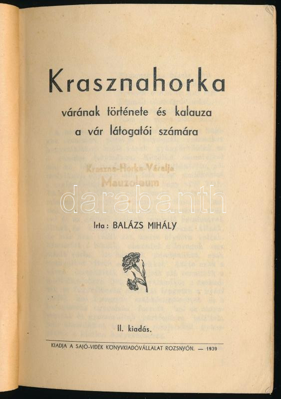 Balázs Mihály: Krasznahorka várának története és kalauza a vár látogatói számára. Rozsnyó, 1939, Sajó-Vidék. II. kötet86 p + 1 kih térkép. Kiadói papírkötés