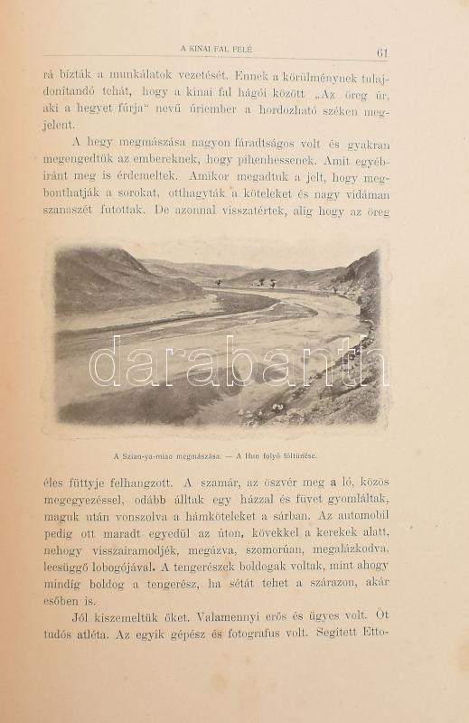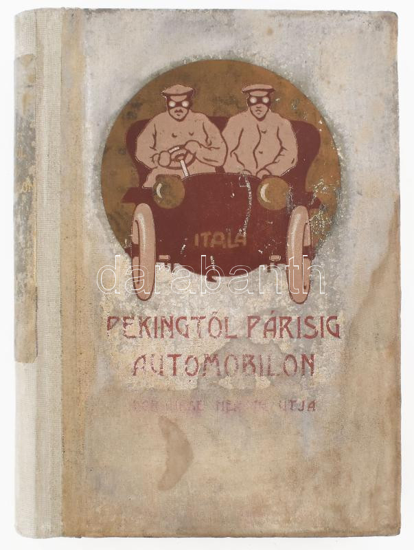 Barzini, Luigi: Pekingtől Párisig automobilon. Borghese herceg utja. Ford.: Garády Viktor. Bp., 1908, Singer és Wolfner, XIX+1++470+5 p. + 11 t. + 1 térkép (kihajtható). Számos szövegközi és egészoldalas, fekete-fehér fotóval illusztrálva. Javított-restaurált gerincű kiadói illusztrált, festett, aranyozott gerincű egészvászon kötés, Gottermayer-kötés, kopott, foltos borítóval, egy hiányzó táblával. "1907. június 10-én öt autóban tizenegy sofőr indult útnak Pekingből. Közülük Scipione Borghese (herceg) autóversenyét követi figyelemmel a kíséretében tartózkodó olasz újságíró. A Kínán, Mongólián, Szibérián és Oroszországon, Németországon és Belgiumon keresztül vezető 15 ezer kilométeres utat Scipione Borghese 62 nap alatt tette meg, és 1907. augusztus 10-én elsőként érte el Párizst. A következő versenyzők három héttel később értek célba. Az úti kaland leírását erősen átszövi a technikai újítások iránti leplezetlen csodálat, és a motorgyártó olasz nemzeti büszkeség. Kötetünk egyszerre technikai leírás, úti napló, illetve érdekességekkel, népszokások leírásával átszőtt néprajzi összefoglaló a bejárt vad vidékekről, Kelet- és Észak-Ázsiáról."
