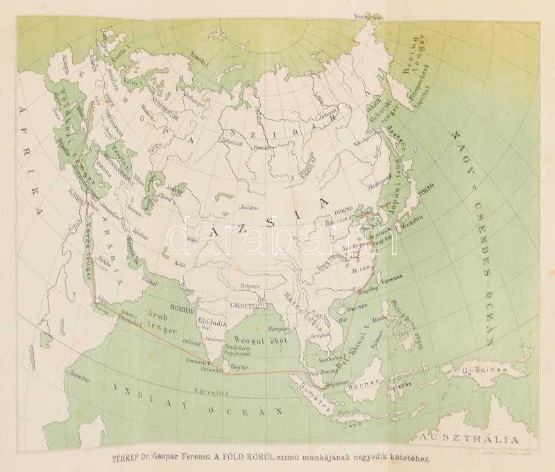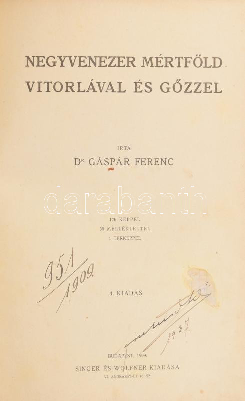 Gáspár Ferenc: Negyvenezer mértföld vitorlával és gőzzel. Kenedi Géza előszavával. Bp., 1909, Singer és Wolfner, 1 (színes címkép) t. 479 p. + 24 (közte 2 színes képtáblával) t. + 1 (kihajtható térkép) t. 4. kiadás. Rendkívül gazdag szövegközti, és egészoldalas képanyaggal illusztrált. Kiadói egészvászon-kötés, kissé kopott, kissé foltos borítóval, 4 hiányzó táblával.