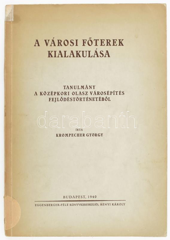Krompecher György: A városi főterek kialakulása. Tanulmány a középkori olasz városépítés fejlődéstörténetéből. Bp., 1940, Eggenberger. Kiadói papírkötés, kissé kopottas állapotban.