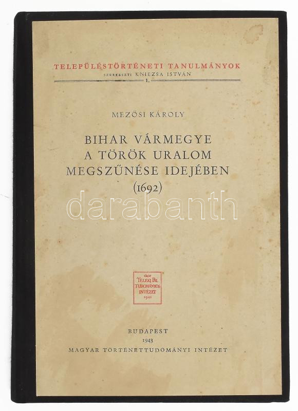 Mezősi Károly: Bihar vármegye a török uralom megszűnése idejében (1692). Településtörténeti Tanulmányok 1. Bp., 1943, Magyar Történettudományi Intézet, 370+(2) p. Térkép-mellékletek nélkül. Átkötött egészvászon-kötésben, jó állapotban, egy-két kissé foltos lappal.