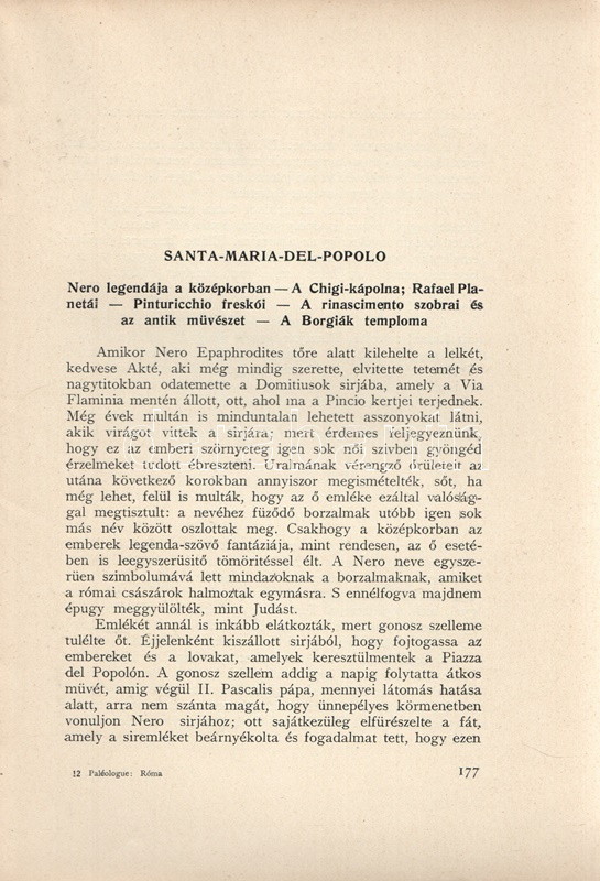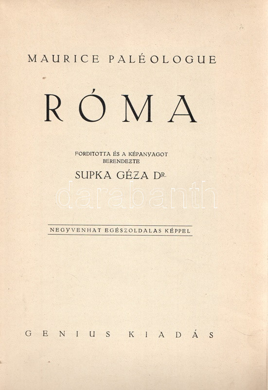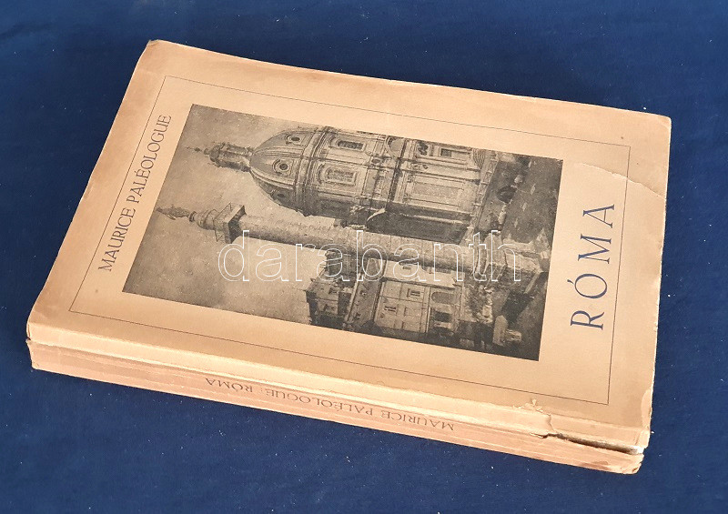 Paléologue, Maurice: Róma. Fordította és a képanyagot berendezte Supka Géza. (Budapest), [1930]. Genius kiadás (Kunossy Grafikai Műintézet Rt.) 320 p. Egyetlen magyar kiadás. Maurice Paléologue (1859-1944) francia diplomata, történész, regény- és esszéíró. Jogász tanulmányai után a francia diplomáciában helyezkedett el, konzuli, nagyköveti pozícióban szolgált többek között Tangerben, Pekingben, Rómában, Szófiában, majd 1914-1917 között Szentpétervárott. Legnevezetesebb emlékirata a cári Oroszországot megörökítő írása, ám korábban is éles szemű megfigyelőnek és élénk fantáziájú írónak számított. Korai kultúrtörténeti és művészettörténeti írása római tartózkodásának gyümölcse, az egyes nevezetes helyszínek kapcsán rengeteg történeti anekdotát és legendát sző bédekkernek is használható városismertetőjébe, mely döntően az antik, a középkor, a reneszánsz és a barokk korszak Rómájával foglalkozik. A munka eredeti nyelven először 1902-ben jelent meg. Oldalszámozáson belül 46 egész oldalas felvétellel. Példányunk fűzése meglazult. Fűzve, illusztrált, sérült kiadói borítóban.