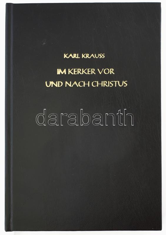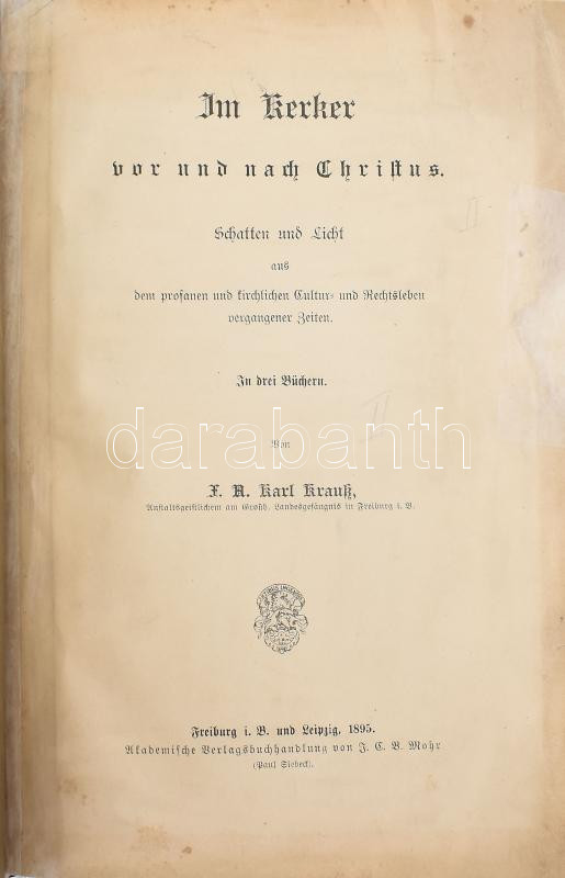 Krauß, [Franz Adam] Karl: Im Kerker vor und nach Christus. Schatten und Licht aus dem profanen und kirchlichen Cultur- und Rechtsleben vergangener Zeiten. Freiburg-Leipzig, 1895, J. C. B. Mohr, IX+(1)+380 p. Átkötött, aranyozott műbőr-kötésben, sérült, javított címlappal, a könyv elején két lapot rossz sorrendben kötöttek be.