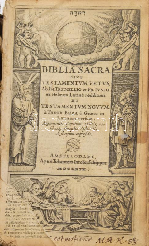 [Szent Biblia] Biblia sacra sive Testamentum Vetus [...] et Testamentum Novum [...] Amstelodami [Amszterdam], 1669, Iohannem Iacobi Schipper, 956 p. Latin nyelven. Korabeli egészbőr-kötésben, viseltes állapotban, sérült, a könyvtesttől elváló borítóval, helyenként sérült lapokkal, ázásnyomokkal.