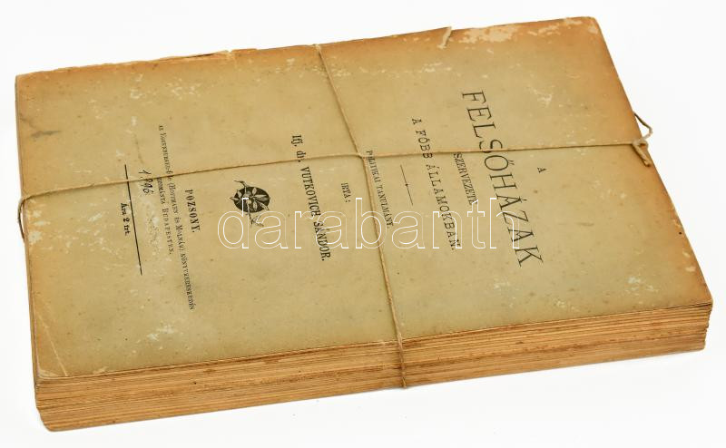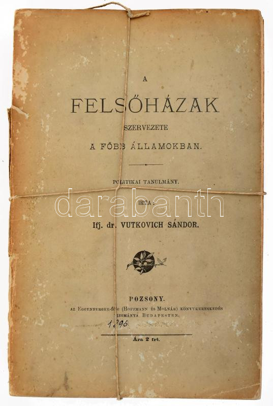 Vutkovich Sándor, ifj. dr.: A felsőházak szervezete a főbb államokban. Politikai tanulmány. Pozsony, 1896, Eggenberger-féle könyvkereskedés (Wigand F. K.-ny.), 2 sztl. lev.+ 321+(3) p. Sérült kiadói papírkötés, széteső, javításra szoruló állapotban.