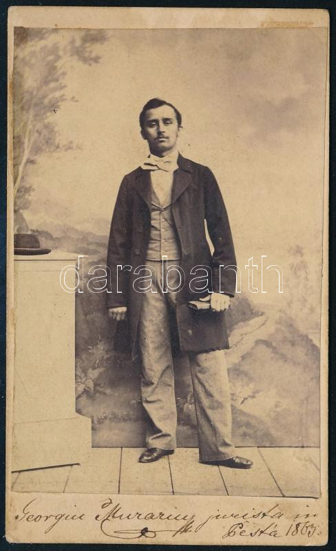 cca 1863-1869 Murariu György (Georgiu Murariu) erdélyi-bánáti román jogász fiatalkori portréja, pesti joghallgatóként (később Lugoson ügyvéd), sajátkezű aláírásával és datálásával, jelzés nélküli keményhátú fotó, 10,5x6,5 cm