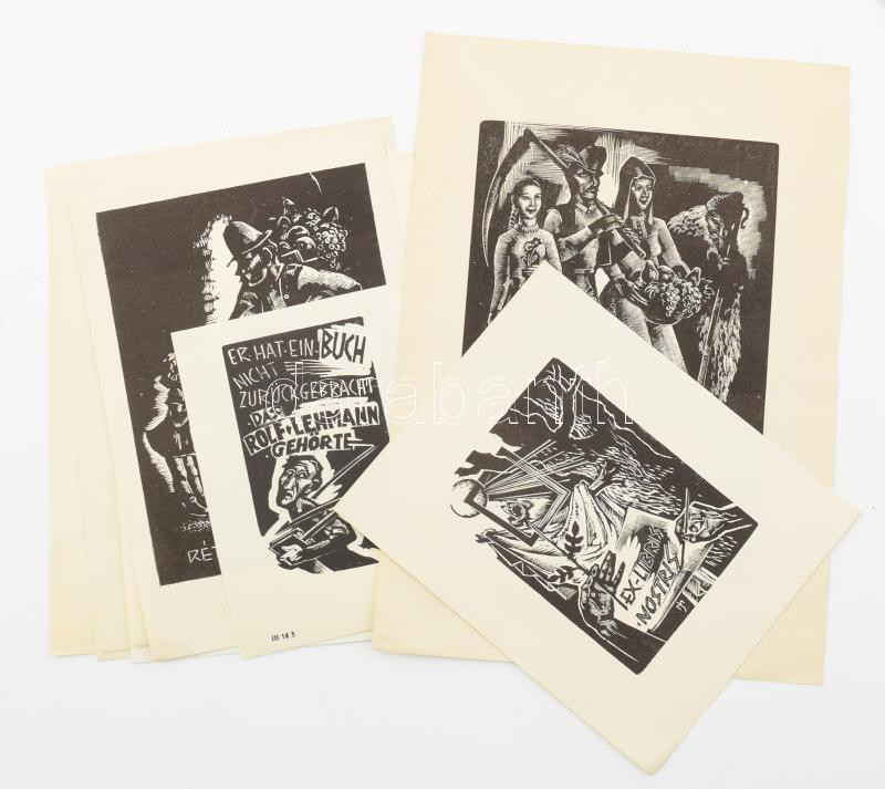 Menyhárt József (1901-1976): 10 db klf. ex libris és kisgrafika. Fametszet, papír, részben jelzett, részben jelzett a metszeten. Klf. méretekben. Egyik félbehajtva.