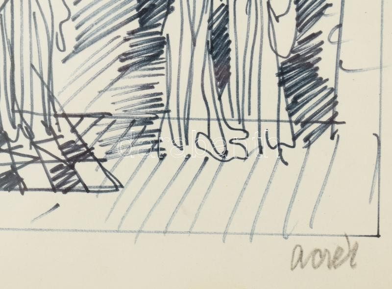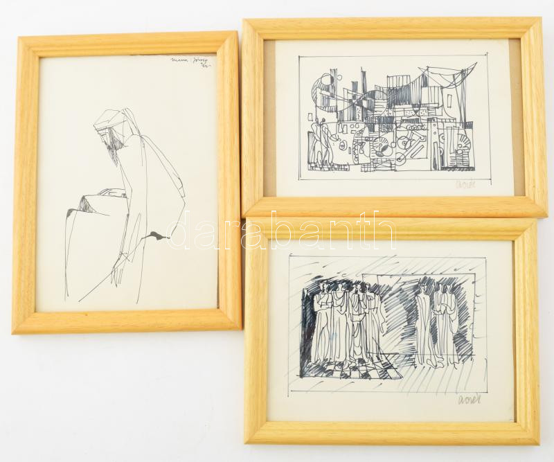 Aczél Ilona (1929-2000), össz. 3 db rajz: Alakok, kapcsolóterem és illsutráció Thomas Mann: József és testvérei c. regényéhez. Tus, filctoll, papír, 2 db jelzett. Üvegezett fakeretben. 13x19 cm körüli méretekben.