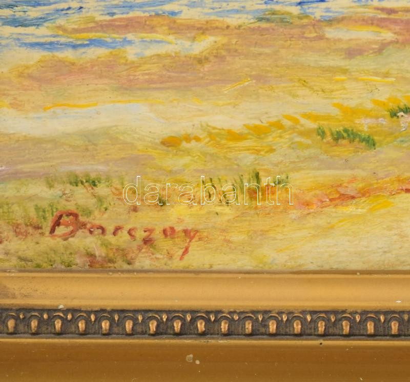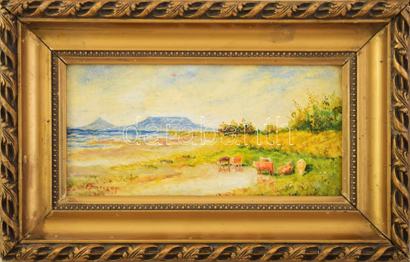 Barczay jelzéssel: Tehenek a Balaton partján. Olaj, fa. Dekoratív, kissé sérült fakeretben. 12,5x24,5 cm