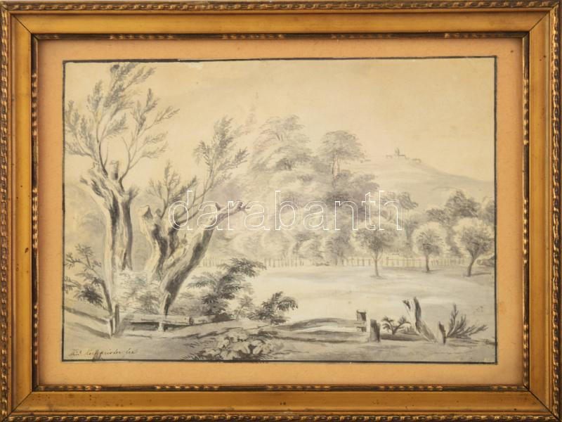 Beschreibung: Frid. Kochmeister jelzéssel, XIX. sz.: Táj. Tus, papír. 17x24 cm. Üvegezett fakeretben.