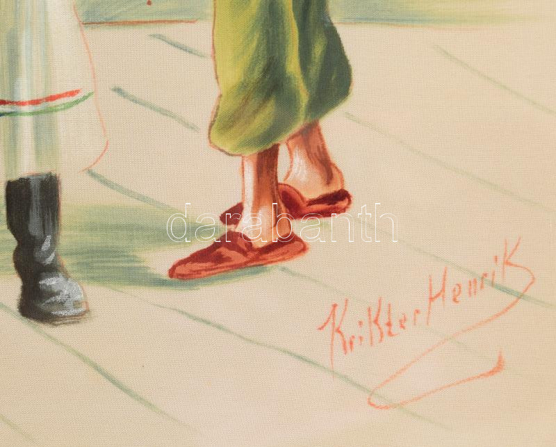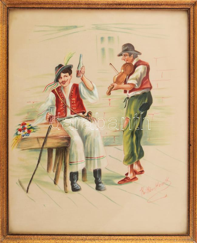 Olvashatatlan jelzéssel (...Henrik): Magyar dínom-dánom. Akvarell, selyem. Dekoratív, üvegezett fakeretben. 38,5x31,5 cm