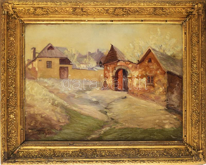 Beschreibung: Olvashatatlan jelzéssel, magyar festő: Tabáni részlet, 1924. Olaj, vászon, kartonon. 52x68 cm. Antik, sérült, részben javított fakeretben.