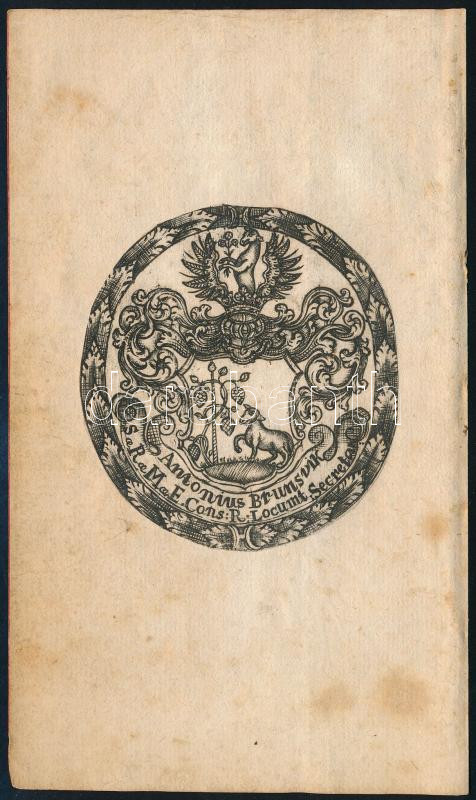 Beschreibung: Idősebb gróf Brunszvik Antal (1709-1780) kúriai személynök, Bihar vármegye főispánjának ex librise, szép állapotban, foltos, 16,5×9,5 cm
