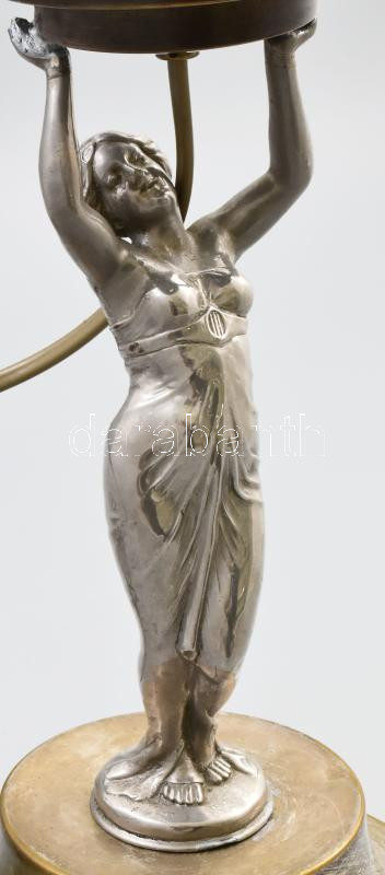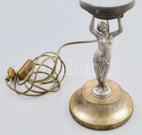 Beschreibung: Asztali lámpa Antik nikkelezett szec/art deco női alak tart feje felett nagy méretű mattfehér gömb üveg lámpabúrát, új kábelezéssel M50cm Talp 16cm