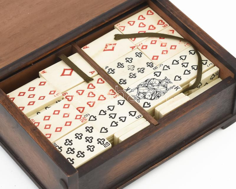 Kártya dominó készlet. 2x52 db fa dobozban, 12x17 cm https://www.darabanth.com/de/477-Fernauktion/477.0/Kunst-Dokumente-andere-Sammelgebiete/Antik~1000009/Kartya-domino-keszlet-2x52-db-fa-dobozban-12x17-cm~II3250691