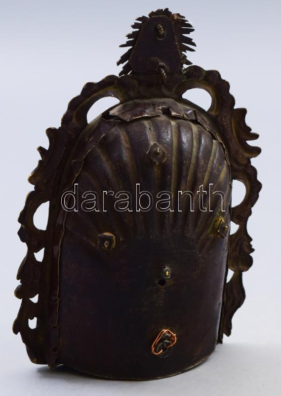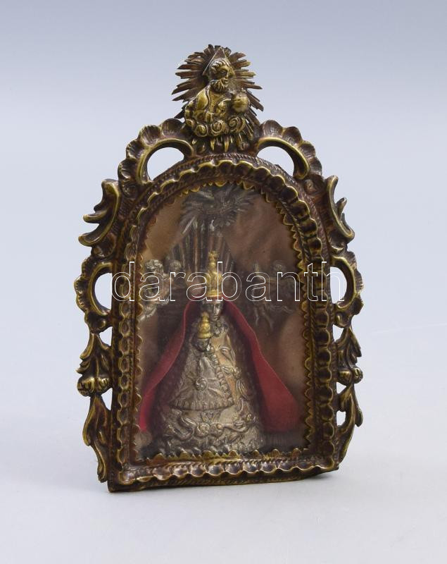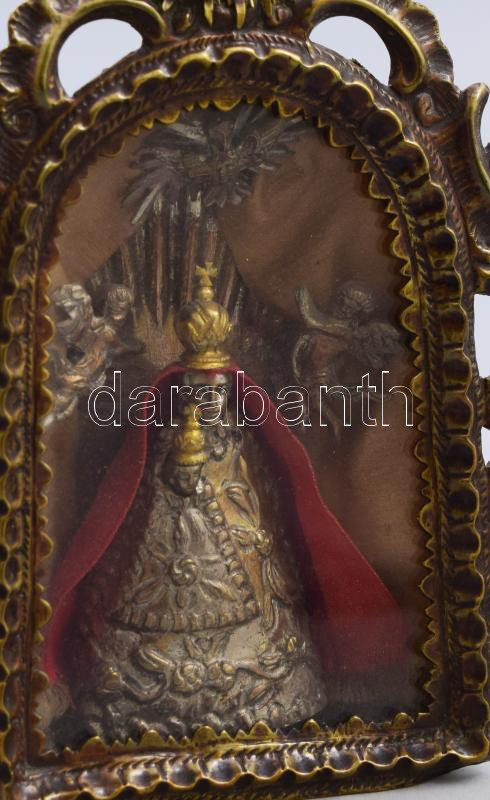 cca 1800, Mariazelli kegytárgyemlék: a Mariazelli kegyszobornak a jelenés szimbólumaival övezett ábrázolása, díszes üvegezett réz tárgyvitrinben, hátoldalán restaurálás és pótlás nyomaival, m: 16,5 cm