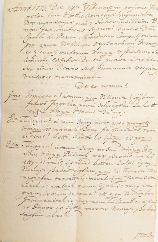 1773 Forgolány, tanúvallatási jegyzőkönyv Perényi Károly főispán előtt. Vincze János és György nemes árvák nemessége ügyében. Zörög János szolgabíró, Bogárdy Elek megyei ülnök. gyűrűspecséttel hitelesítve 7 beírt oldal