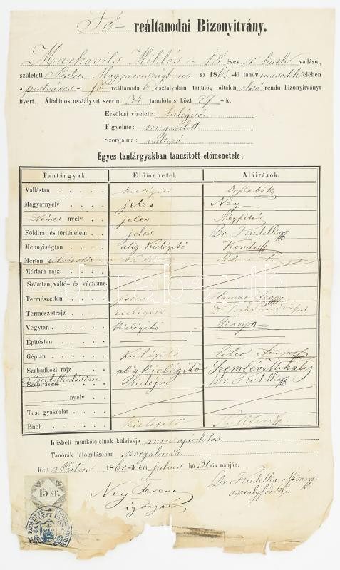 1862 Markovits Miklós Fő-reáltanodai bizonyítványa, 15kr okmánybélyegg... https://www.darabanth.com/de/477-Fernauktion/477.0/Kunst-Dokumente-andere-Sammelgebiete/Dokument~1000023/1862-Markovits-Miklos-Fo-realtanodai-bizonyitvanya-15kr-okmanybelyeggel-serult~II3250057