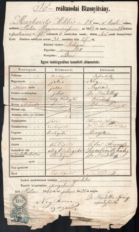Beschreibung: 1862 Markovits Miklós Fő-reáltanodai bizonyítványa, 15kr okmánybélyeggel, sérült