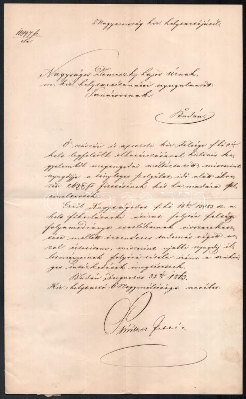 1863 Buda, kir. helytartó nevében kiállított levél nemes Demeczky Lajos nyugalmazott helytartósági tanácsos (1840-ki országgyülésen Kassa város követe, a katonai élelmezés tárgyában választmányi tag, 1848-ban az első magyar ministeriumban a belügy titoknoka) nyugdíja ügyében, magyar nyelven, papírfelzettel, 15 kr. kézzel áthúzott okmánybélyeggel, egy kézzel írt oldal, beazonosítandó aláírással, hátoldalán egyik sarkában vágott