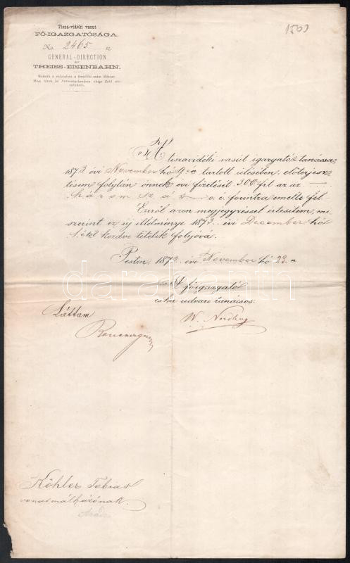 1873 A Tiszavidéki vasút főigazgatóságának vonatmálházó részére adott ... https://www.darabanth.com/de/477-Fernauktion/477.0/Kunst-Dokumente-andere-Sammelgebiete/Dokument~1000023/1873-A-Tiszavideki-vasut-foigazgatosaganak-vonatmalhazo-reszere-adott-fizetesemelesrol~II3244099