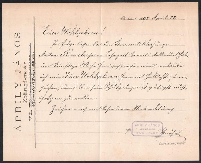 1892 Bp., Áprily János kőfaragómester fejléces üzleti levele https://www.darabanth.com/de/477-Fernauktion/477.0/Kunst-Dokumente-andere-Sammelgebiete/Dokument~1000023/1892-Bp-Aprily-Janos-kofaragomester-fejleces-uzleti-levele~II3251611